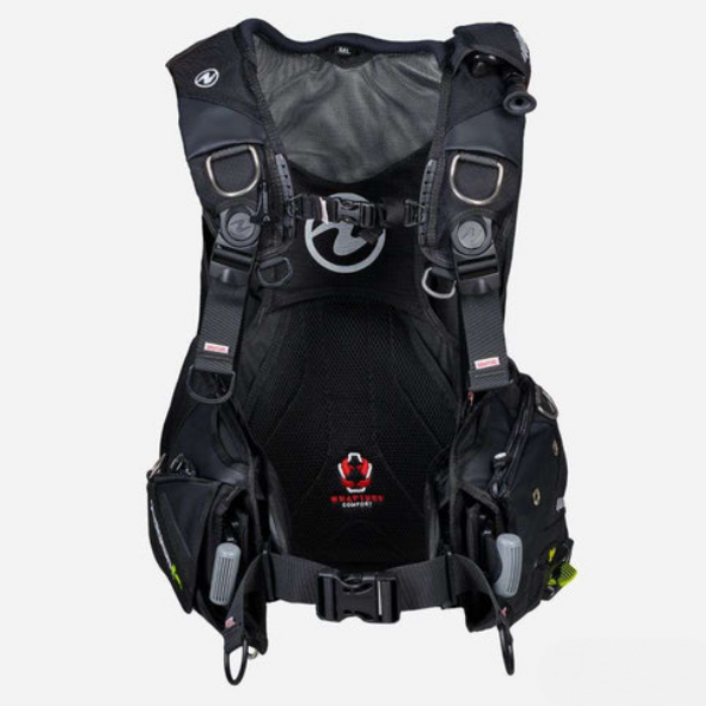 WRAPTURE HARNESS: an ultra-thin inner harness that fixes BCD snug to the body to prevent riding up in the water whilst also distributing weight evenly by holding the tank closer to your centre of gravity, allowing you to stand & walk upright with ease